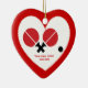 Table tennis ping-pong rackets and ball black, red heart shape ceramic ornament displaying a minimalist pictogram icon of red black table tennis rackets and ball and your text on white background with red border. See lots of designs at our Sports Gifts store.