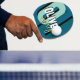 Stylish table-tennis-racket personalized with his first name and surname in cool font styles, over a blue background with big oversized initial letters with black shadow... modern monogrammed design, with the name of the stylish player.