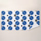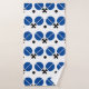 Table tennis ping-pong rackets and ball black, blue custom tennis table bathroom towel set showcasing a minimalist pictogram icon of blua and black table tennis rackets and ball. The hand towel includes a striped pattern in blue, black and white and the washcloth is of solid blue color.
