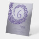 This wedding table number card is designed with an elegant and decorative ornate frame made from intricate damask patterns in shades of purple and lavender. The swirling damask design forms a circular border, gracefully enclosing the large table number in the center. The typography balances modern clarity with a touch of refinement, while the word “Table” is styled in flowing script to enhance the romantic and formal look.