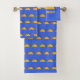 A cute little ratty friend made from tasty taco. The two bigger towels have a pattern of taco rats. The washcloth has a single rat with the word TACORAT (can be changed for a custom word). The background is blue.