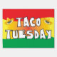 Taco Tuesday sign banner for Mexican restaurant or taco event special. Attention getting bright colors can be seen from a distance. Red, green and yellow background with sombrero illustrations and trendy hand-cut font on double-sided sign.