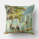 Photo throw pillow cushion with an image of a vintage style postcard of a tropical beach with palm tree on Tahiti with in photo-filled characters the text 'Tahiti'. A great retro souvenir to keep or give to friends or family.