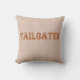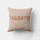 Football themed throw pillow features "Tailgater" in a distressed brown football font on a burlap background. Perfect for man caves