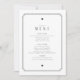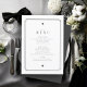 The striking menu card shown here on a white background, provides a template to easily add your dinner selections, names and wedding date. Set a refined tone for your wedding celebrations with this minimalist design. Featuring sleek graphics that echo the refined details of a classic tuxedo, this wedding collection includes elements like pleated patterns, crisp whites and glossy black accents for a tailored, modern vibe. Perfect for two-groom couples who love bold minimalism, this design delivers an effortlessly elegant aesthetic that’s both timeless and sophisticated. Search ID1090 to see other pieces in this coordinated wedding set.
