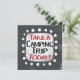 "Take a Camping Trip Today" is a cute text design in gray with black and red text. It sits on a white accent shape and cute white polka dots surrounding it.