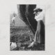 Old golfing and early 1900s fashion photo. Woman brooding as man on golf course swings golf club at two men in background, 1906.