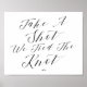 Simple Elegant Calligraphy Script Wedding Reception Party Bar Sign - take a shot we tied the knot - in beautiful flowing fancy letters and your personalized text. A stylish yet simple formal design in black and white or any background color you choose. Just click the customize further link, shown under the text personalization area on the right, and choose your custom color background. This sign poster template makes it fast and easy to create stunning additions to your wedding decor. Signs can be enlarged, there are many sizes to choose from, as well as options for custom framing and matting. Welcome custom signage.