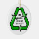 Using a round ornament to represent our globe, a green recycle symbol is printed on one side. Within the center are the words: we only have one planet and beneath that it says: take care of it (both phrases printed in black) The flip side of the ornament has a wire globe with the words: recycle, reuse, redistribute and reconnect printed in green around the edges of the globe. In the center in the same green color are the words: Our Planet.