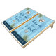 “Take me to the beach.” Wherever you set up this cornhole set, you can be rest assured that the summer seashore fun will continue. Beachy light, aqua blue wood with a coral heart, coastal sea grass, and artsy, handwritten script typography complete the coastal look. Great for family reunions, weddings, and backyard bbqs!
