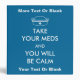 A parody of the popular "KEEP CALM AND CARRY ON" theme. A nurse's cap replaces the familiar crown accompanied by text reading, "TAKE YOUR MEDS AND YOU WILL BE CALM." Do what the nice nurse tells you to do. Customize by adding your own text in two places on the front, and another on the spine.