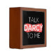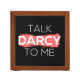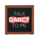 'Talk Darcy to me' phrase inspired by Jane Austen's character Mr. Darcy from the book Pride and Prejudice.