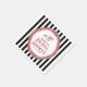 This Derby party napkins has a watercolor race horse with a jockey in pink surrounded by a wreath of red roses with the saying "Bridal Shower" There is a black and white striped background. You can personalize with a name and date.