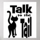 Black and white design with a black cat walking away and "Talk to the Tail" at the right.