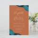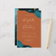A teal blue watercolor agate design trimmed with faux gold glitter appears in two corners of this elegant design. Personalize it with the couple's names in gold-colored handwriting script over a large ampersand. Add the wedding details in gold-colored copperplate and italic fonts on a burnt orange or rust background. The reverse side features a matching teal and gold agate design.