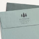 Return address rubber stamp features your name and return address beneath a trio of pine tree silhouettes, perfect for forest, mountain or woodland homeowners, or as a charming finishing touch for your holiday cards.