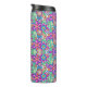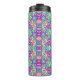 Tall travel mug with a vibrant, symmetrical floral pattern in bright pink, blue, and green hues. The design exudes a lively, playful feel.