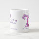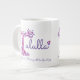 Pretty hand-drawn letter T monogram name and meaning mug in purple, pink and white. Ideal for a personalized gift for a girl who has a name that starts with the letter T. This example reads Talulla Abundant princess. Flowing with beauty and joy or you can customize the text with your own name and words or date of birth if required. Other names and name meanings are available. If you need help with your own personalized name please contact me. © Letter T with name and name definition lettering, hearts and flowers drawing and pattern uniquely created and designed by Sarah Trett for www.mylittleeden.com