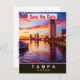 Tampa save the date wedding invitation, travel postcard. Beautiful sunset over the city waterfront in vibrant colors.