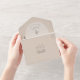 Tan arch with black text and Botanical line art. Outside is tan with return address on flap. RSVP at bottom.