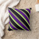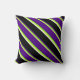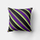 This throw pillow design features stripes colored tan, chartreuse, indigo, black, and white.
