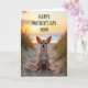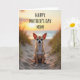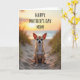 This card shows a small tan-and-white dog sitting neatly on a gently rippled sandy path, ears perked as if listening closely and eyes meeting yours with a tender, trusting look ❤️. Behind it, a calm shoreline stretches out with soft ocean blues fading toward a slightly blurred horizon. Warm late-day sunlight pours in from the distance, wrapping the dog’s outline in a faint glow and giving the scene a cozy, affectionate feel. Wispy dune grasses line both sides of the sand, their thin blades catching golden highlights like little sparks. Across the upper portion, a Mother’s Day greeting appears in clear lettering, set in a dark tone that stands out against the bright sky. The overall colors stay in gentle oranges, pale yellows, and earthy tans, like a quiet walk shared with someone you care about 🌼. Fine grains of sand and the delicate grass tips are sharply visible in the foreground, while the sun sits low near the center of the sky above the water.