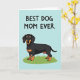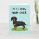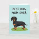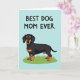 Designed with a calm pastel blue-green background, the card opens with a large line of black, sans-serif lettering centered near the top, giving the message plenty of breathing room. The letters have a slightly hand-drawn look that feels friendly and close, like a note left for someone you care about ❤️. Beneath the text, a long-bodied dog with short legs and droopy ears stands as the main figure, outlined in a dark line that keeps the shape clear. Its coat is mostly deep black with warm tan accents on the muzzle, chest, and paws, and its forward-facing eyes carry a gentle, curious look, as if waiting for a familiar voice. A small patch of green grass sits under its feet, adding a grounded, everyday setting that suits a sweet bond between companions 🌼. The overall layout stays simple with flat areas of color and lots of open space, keeping attention on the dog and the message above. At the bottom, the grassy patch is made of small, pointed blades in a rich green tone.
