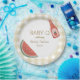 Tan gingham circular baby-q themed baby shower plate for gender neutral event.