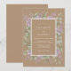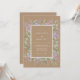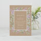 This design features a warm earth-toned background providing a beautiful foundation for the floral elements. Delicate sprigs of purple lilacs and soft green eucalyptus leaves are layered around the center. Intricate white lace-like detailing adds a touch of vintage elegance. Perfect for a rustic outdoor event, the color palette combines tan, lavender, and sage green.