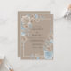 This design features a warm tan backdrop adorned with soft watercolor florals in shades of dusty blue and cream. Delicate roses and lush peonies cluster beautifully, creating a romantic and earthy aesthetic. The palette evokes a serene vintage feel, perfect for a rustic outdoor or barn setting.