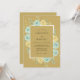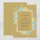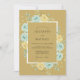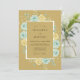This design features a warm ochre backdrop adorned with soft watercolor roses in shades of aqua blue and pale yellow. Delicate green leaves and sprigs of foliage surround the central area, creating a romantic and vintage-inspired aesthetic. The color palette offers a unique blend of earthy tones and cool floral accents, perfect for a spring or summer event.