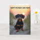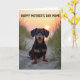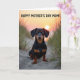 Designed with a small, low-to-the-ground dog centered on a sandy path, the scene feels like a quiet walk shared with someone you love ❤️. The dog has a sleek dark coat with warm tan markings on its muzzle, chest, and paws, sitting upright with an attentive gaze that meets the viewer like a gentle hello. Long, velvety ears frame its face, and the soft edge lighting gives its features a tender, caring look. Around it, pale sand ripples toward the horizon, with scattered tufts of green grass that lean as if stirred by a light seaside breeze. The sky glows in soft oranges and yellows, suggesting early morning or late evening and wrapping the whole setting in a calm, affectionate warmth 🌼. Near the top, the message “HAPPY MOTHER’S DAY MOM!” is placed in a neat, flowing style, standing out in a light tone against the warm sky. The sun appears as a large luminous circle in the upper background, casting a thin golden rim along the dog’s back and ears.