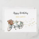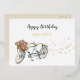 Cute birthday postcard, featuring a watercolor vintage tandem bicycle and a flower basket with gold foil heart-shaped petals.