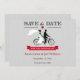Trendy Save the Date cards with a bride and groom on a tandem bicycle. Fun vintage design with a red banner on a grey background. Also available in other colors. Get the matching save the date stamps below: