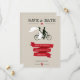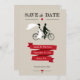 Trendy Save the Date cards with a bride and groom on a tandem bicycle. Fun vintage design with a red banner on a taupe background. Also available in other colors. Get the matching save the date stamps below: