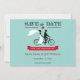 Trendy Save the Date cards with a bride and groom on a tandem bicycle. Fun vintage design with a red banner on an aqua background. Also available in other colors. Get the matching save the date stamps below: