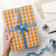 Sunny and fun tangerine and lavender gingham wrapping paper is the perfect design for multiple gift giving scenarios. This gift wrapping would look equally cute for a baby shower gift as it would for a birthday or even as something different and untraditional under the Christmas tree.