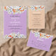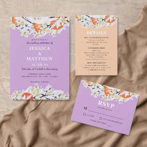 Elegant and chic thank you card with beautiful blooming tangerine branches. Floral botanical card with spring delicate flowers and citrus. Orange, pastel and lilac colors. Personalise with your names.