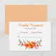 This is a bright and colorful floral wedding RSVP that matches invitations of the same title in our store. It features a pretty floral bouquet in colors of tangerine orange, red, brown and green at the bottom front. Above the image is your custom text in tangerine and brown. The image and text are placed on a white background. The back of the card is soft muted tangerine. Perfect for late summer or autumn events.