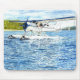 In the Sydney Harbour area of Australia, a pleasure-flight pilot fills the gas-tank of his De Havilland Beaver floatplane in readiness for the next scenic sortie. From original watercolour by Christine Hudson.