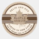 An antique white background with brown text in an old-style font. Brown band behind sugar maple leaf gives this label a vintage look. Add your volume of syrup and location.