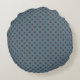 Round throw pillow with a pattern of little targets in light gray and blue on a dark gray background.