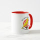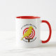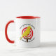 Targeted Individual Awareness Canary mug. Red circles behind design to portray the seriousness of this type of human trafficking.