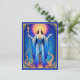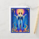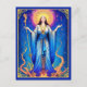 Postcard in the tarot card "The Queen of Wands". Standing regally in flowing blue robes, radiant under a golden halo, she holds a wand, symbolizing power and creativity. Surrounded by fiery branches and stars, she exudes confidence, warmth, and spiritual strength