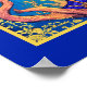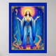 Poster in the tarot card "The Queen of Wands". Standing regally in flowing blue robes, radiant under a golden halo, she holds a wand, symbolizing power and creativity. Surrounded by fiery branches and stars, she exudes confidence, warmth, and spiritual strength