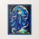 Puzzle in "The World" tarot card portraying a graceful woman in ornate blue robes, symbolizing unity and fulfillment. Standing atop a radiant globe, she embodies harmony, wholeness, and universal connection.