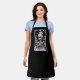 A unique nail technician promotional apron, featuring a skeleton with tools of the nail technician. A unique style with a touch of humor. Pink and white on black.
