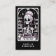 A unique nail technician business card featuring a skeleton with tools of the nail technician. A unique style with a touch of humor. Pink and white on black.