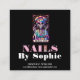 An editable nail artist Tarot themed business card template design, with QR code, social media handles and vintage typography in pink and white on a black background. Scannable QR Code instantly directs clients to your booking page.