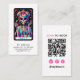 An edgy editable nail artist Tarot themed skeleton business card template design, with QR code, social media handles and vintage typography in pink and white. Scannable QR Code instantly directs clients to your booking page.